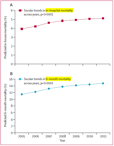 Andamento della mortalità, ospedaliera e a sei mesi, nel corso degli anni. Nallamothu BK et al. Lancet, March 21, 2015