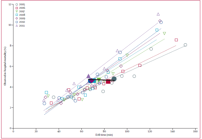 I dati allora disponibili avevano infatti evidenziato una associazione lineare tra il D2B e la mortalità ospedaliera: minor tempo D2B, minor mortalità:2,3