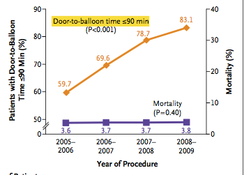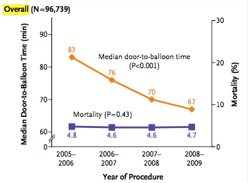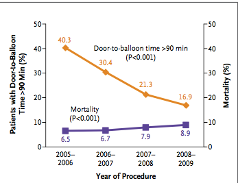 Due recenti studi, sul registro nazionale USA dell’infarto miocardico, hanno rilevato una discrepanza tra: la riduzione del tempo di intervento, raggiunta con la promozione di specifiche iniziative, e la mancata riduzione della mortalità.