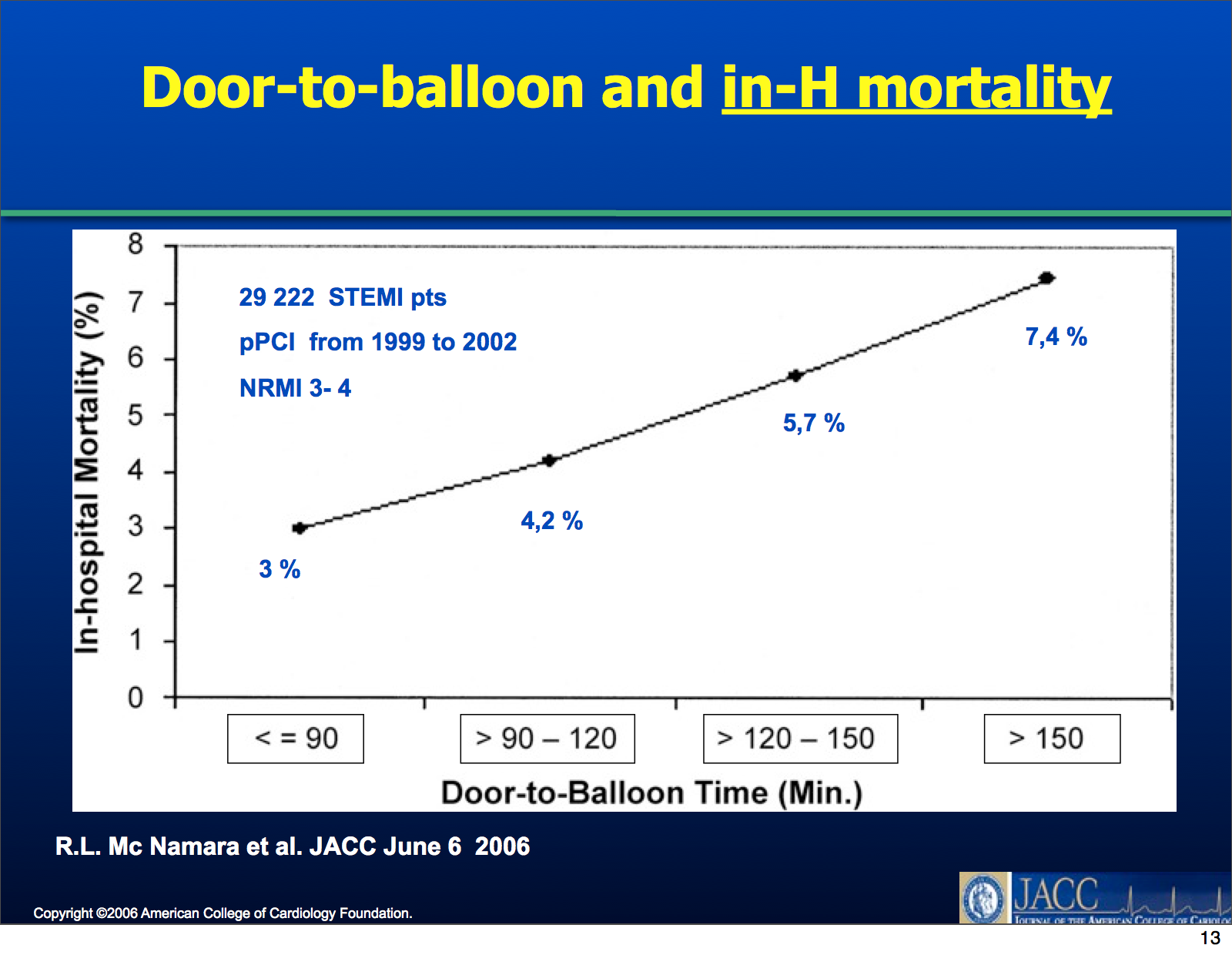 Questo parametro è stato posto al centro delle campagne avviate dalle due principali società cardiologiche americane, nel 2006 e 2007, per ridurre i tempi di intervento nella rivascolarizzazione miocardica con angioplastica primaria.
