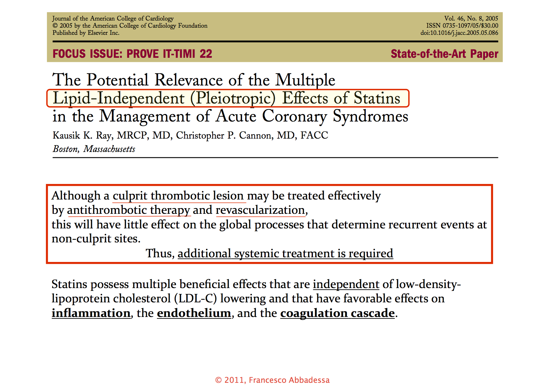 il risultato è un’azione antinfiammatoria, antitrombotica e sulla funzione endoteliale; questi meccanismi non sono ancora stati sufficientemente valutati ma rappresentano comunque una valida ipotesi per spiegare gli evidenti risultati ottenuti indipendentemente dalla riduzione lipidica raggiunta con le statine.